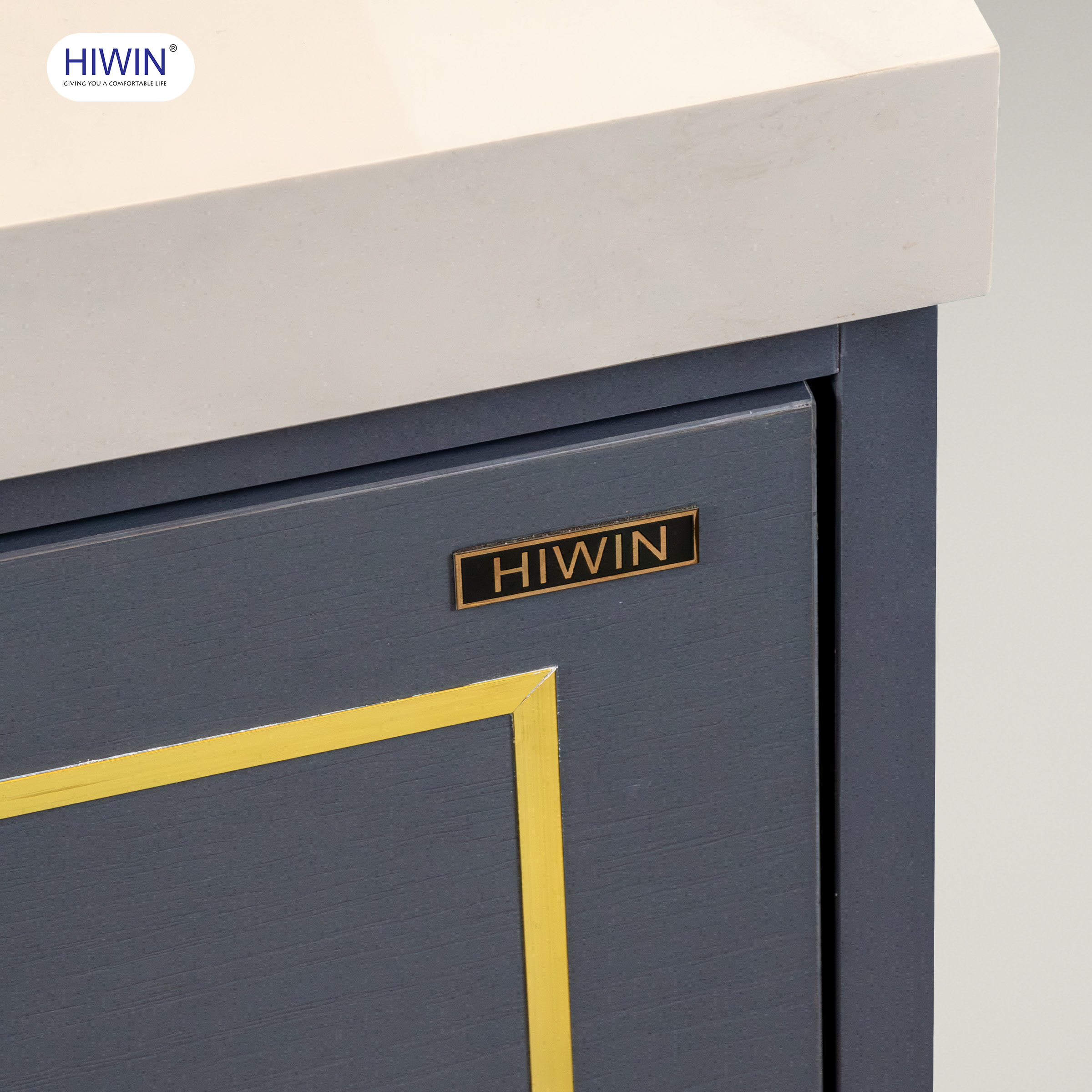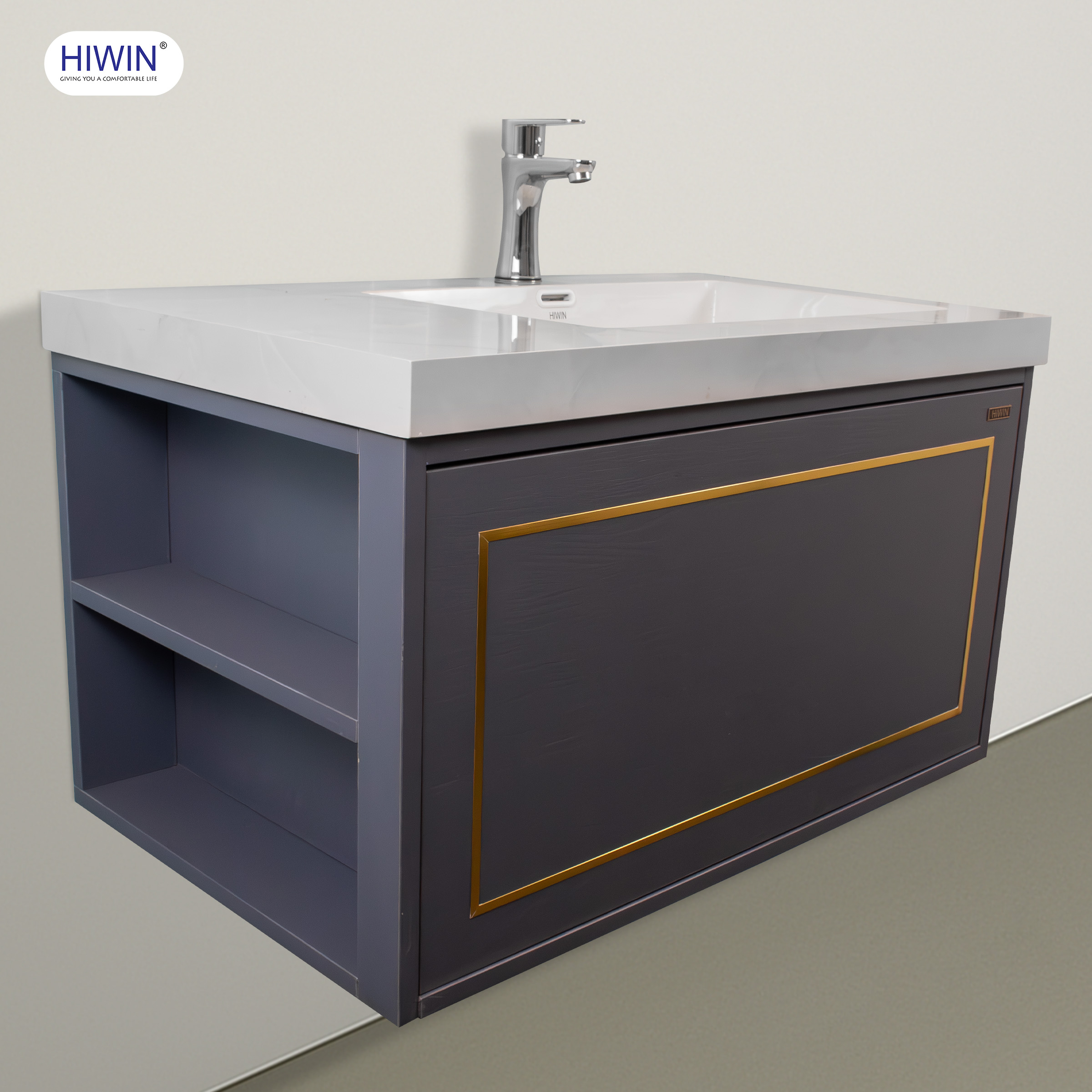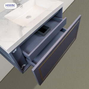 Điểm nhấn nổi bật trong thiết kế chính là màu xanh than trầm ấm – gam màu thời thượng đang được ưa chuộng trong xu hướng nội thất cao cấp. Sự kết hợp tinh tế giữa nền xanh than và nẹp trang trí màu vàng kim ánh nhẹ trên ngăn kéo không chỉ tăng thêm vẻ sang trọng mà còn tạo chiều sâu thị giác, khiến tổng thể tủ nhà tắm hiện đại Hiwin YS-2643 trở nên cuốn hút và đẳng cấp hơn bao giờ hết.