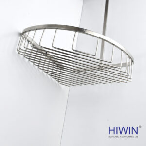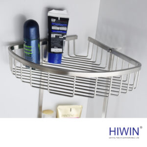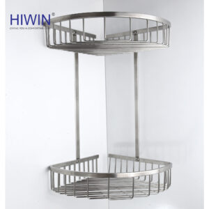Kệ nhà tắm hai tầng thương hiệu Hiwin sở hữu thiết kế theo dạng ôm sát góc tường 90 độ, trụ inox dày nối hai giỏ thành một thể thống nhất vững chãi.