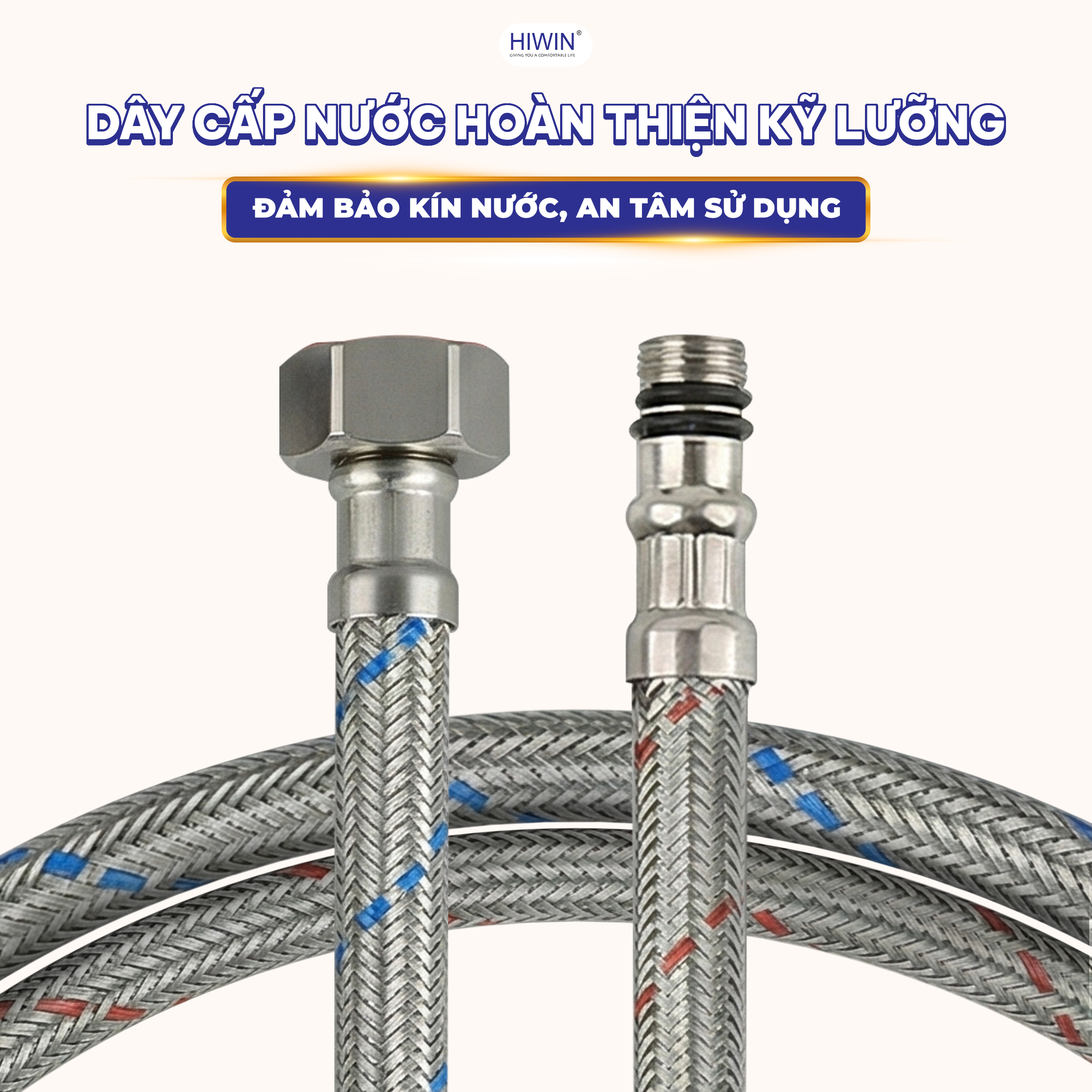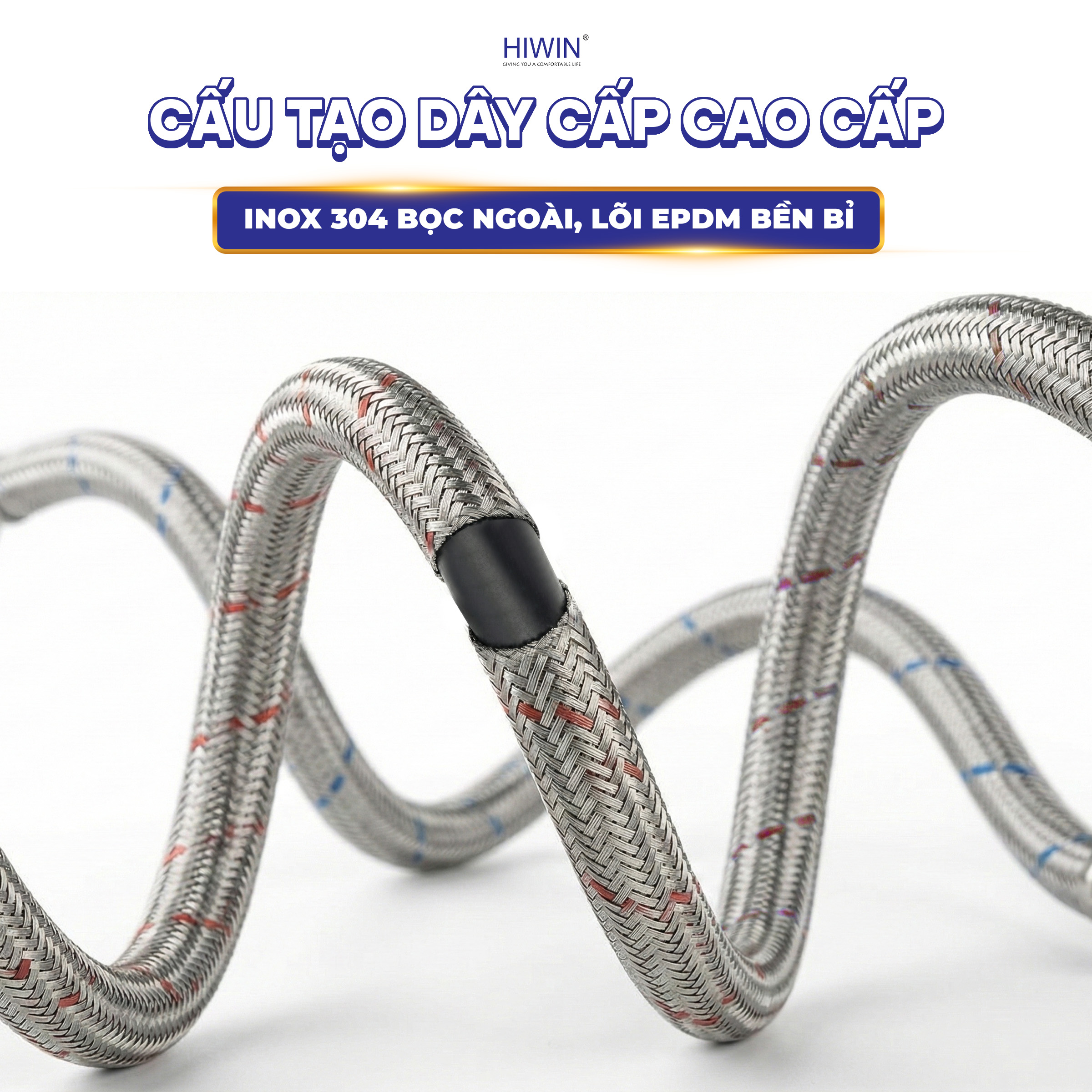 Hiwin KF-101S sử dụng hai dây cấp nước nóng – lạnh riêng biệt, được hoàn thiện kỹ lưỡng nhằm đảm bảo an toàn và độ bền trong quá trình sử dụng lâu dài. Phần vỏ bọc dây cấp được làm từ inox 304, giúp chống ăn mòn và chịu lực tốt trong môi trường ẩm ướt.